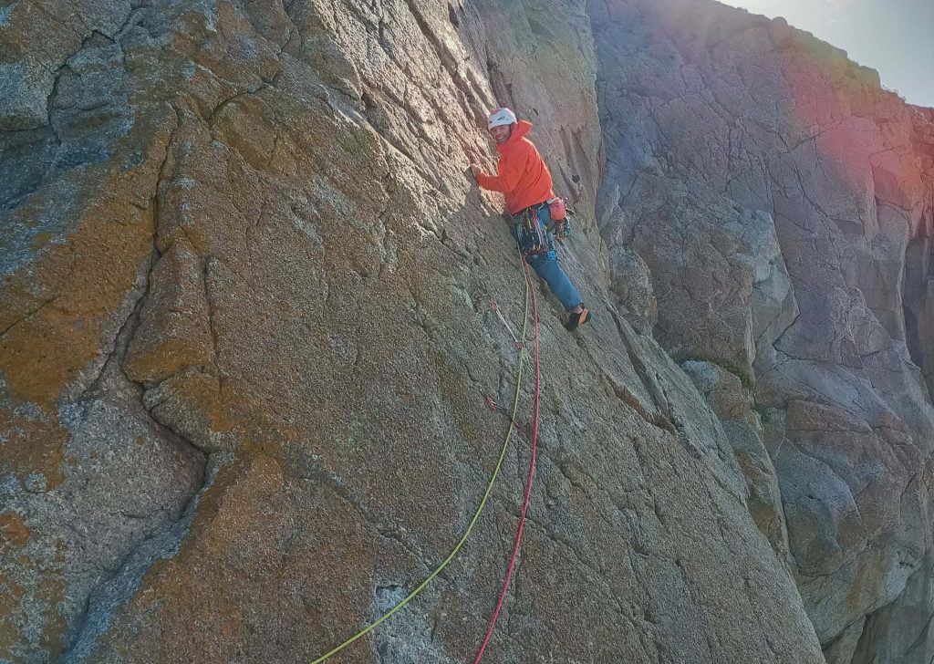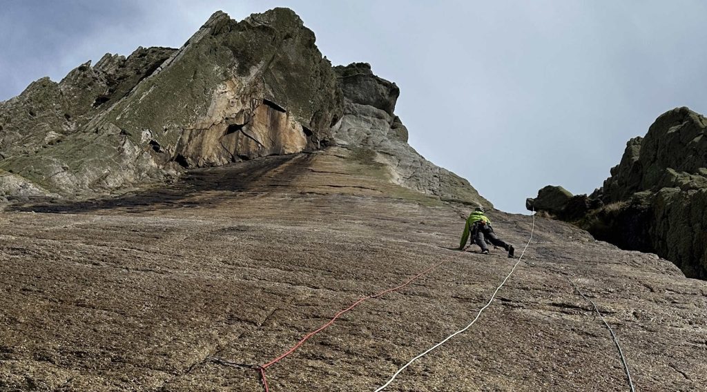 At this point, Bunker had been hanging there for what felt like a very long time, with no communication possible I didn’t know what to do and I didn’t think Paul had got to the really steep bit. I thought if I can get him back to the easy traverse he could get back on, and traverse along a few meters back towards the bags on the beach and come up another easier route,